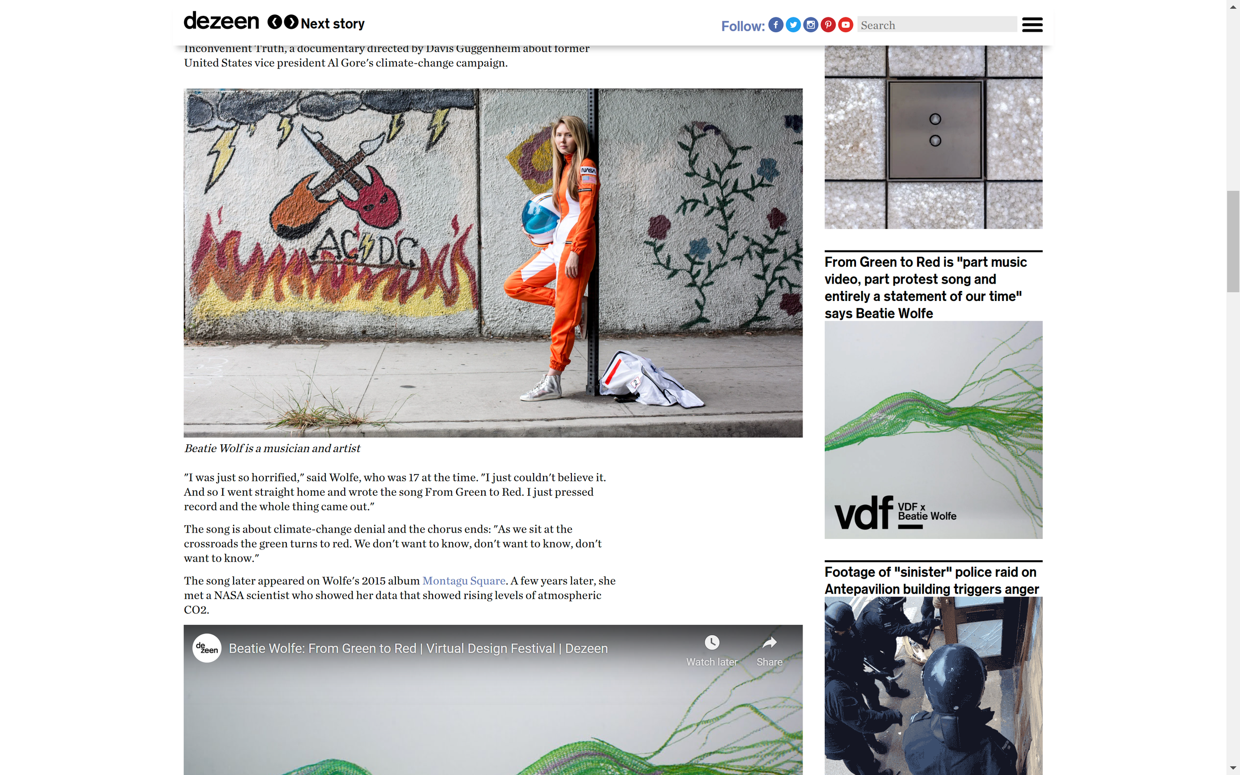 Called From Green to Red, the video acts as a soundtrack to a Beatie Wolfe song of the same name that is about climate change. The project aims to "take intangible data and make it something that people can relate to," Wolfe told Dezeen.