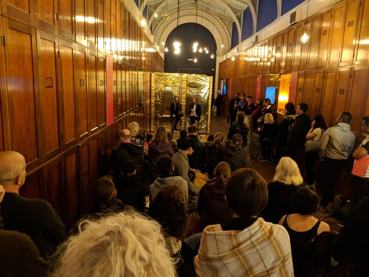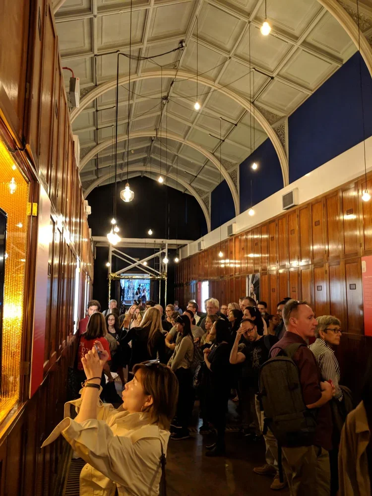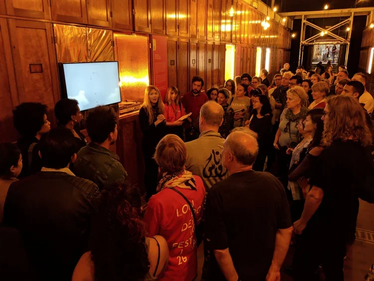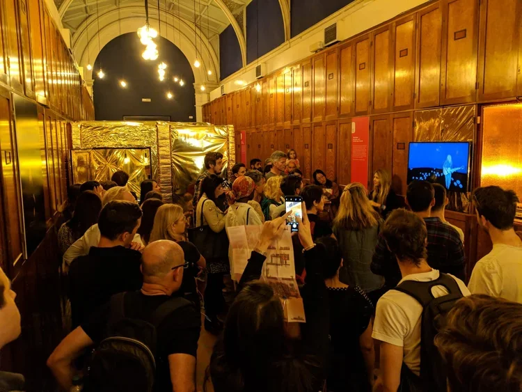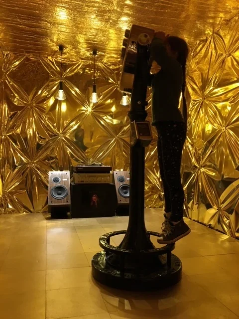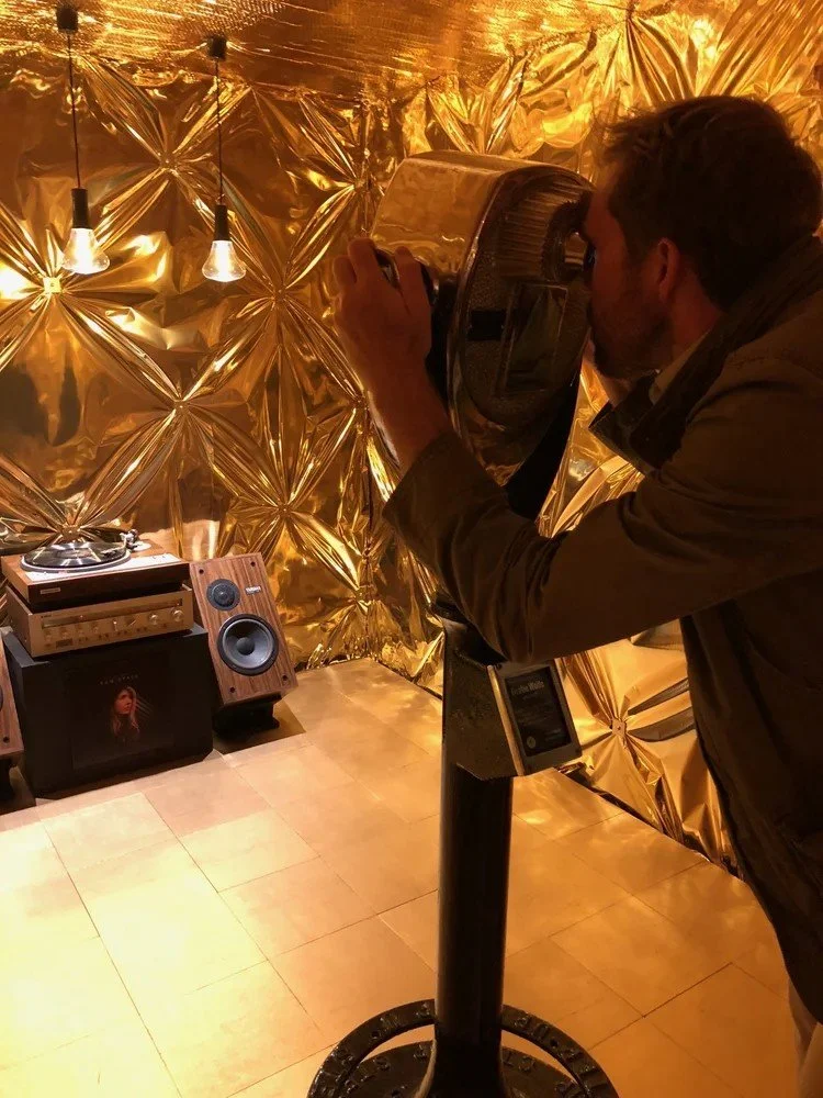 The Raw Space Chamber tells the story of Raw Space – the world’s first live 360° AR stream – in its new portable incarnation. Inside this gilded chamber, installed by Getov and Steely and wrapped in NASA-grade Mylar linking to Wolfe’s Raw Space Beam and Project Echo, visitors can immerse themselves in a truly magical and ceremonial listening experience, while AR animations bring the album’s artwork and lyrics to life in real-time via a vintage coin-operated binoculars viewport and spinning vinyl